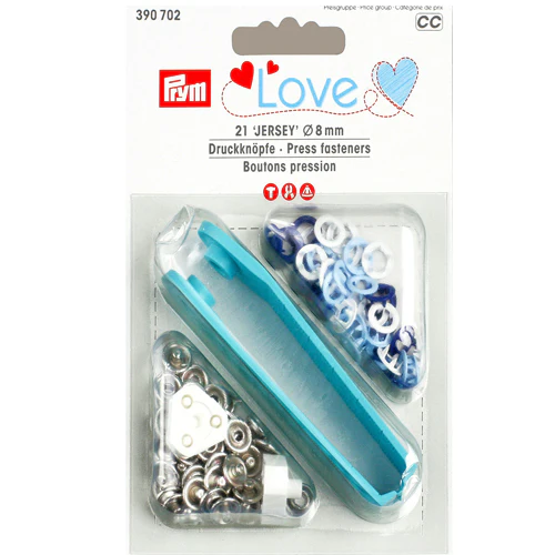 Prym Love Trykknapper- Mørk blå, Lyseblå og Hvit 195,- På lager. Legg i handlekurv Lagerbalanse: 5 Artikkelnummer: 3502 Del Informasjon Artnr: 390702Trykknapper 8mm som er beregnet på Jerseystoffer.